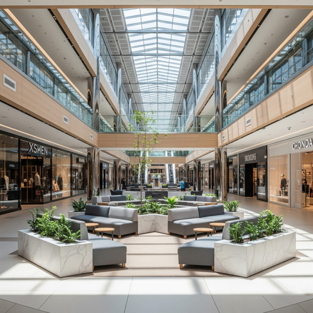 Complementing the glass, an innovative mix of materials defines the mall’s exterior. Polished concrete forms a stoic, grounding presence, its smooth, cool tones providing a stark yet harmonious contrast to the warmer hues of rich wood accents that frame entrances and delineate sections of the facade. Interspersed are panels of lustrous metal, catching the sunlight and adding a subtle, industrial elegance.